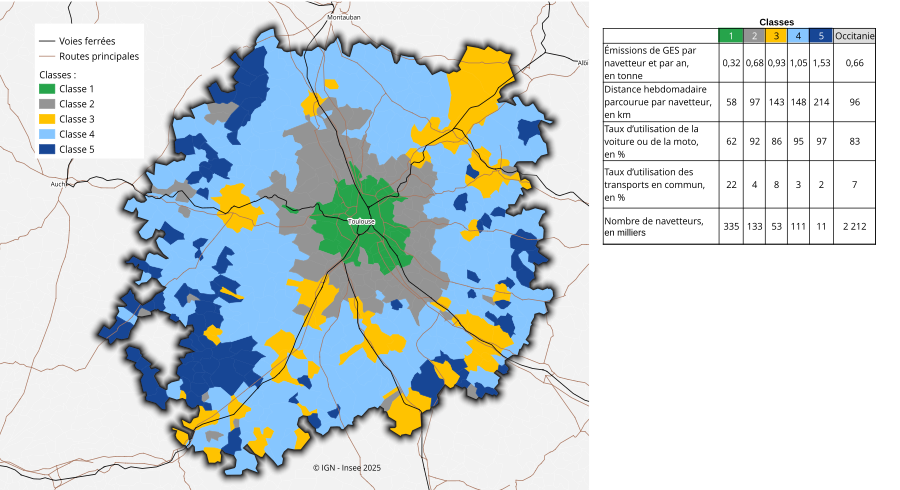 À Toulouse et dans les communes environnantes comme Colomiers, Tournefeuille, Blagnac, Cugnaux, Balma, Ramonville-Saint-Agne, les distances domicile-travail sont réduites et la disponibilité des transports en commun limite l’utilisation de la voiture (classe 1). Dans les communes relativement proches du pôle toulousain (classe 2), les navetteurs utilisent massivement la voiture. Depuis ces communes, l’accès à Toulouse est souvent plus rapide en voiture qu’en transports en commun (cas par exemple de Cornebarrieu ou Labarthe-sur-Lèze). Les navetteurs utilisent davantage les transports en commun dans certaines communes plus éloignées du pôle toulousain (classe 3). Une majorité de ces communes sont situées sur les grands axes ferrés et une part importante de la population vit près d’une gare. Les émissions de GES par navetteur sont ainsi inférieures à celles des résidents de communes aussi éloignées de Toulouse mais où l’utilisation de la voiture est quasi systématique (classes 4 et 5). Dans ces dernières communes, les résidents ne disposent pas d’un réseau de transports en commun leur permettant d’accéder à leur travail depuis leur domicile. Ces zones concentrent 20 % des navetteurs de l’aire d’attraction de Toulouse ; les trajets associés sont responsables de 35 % des émissions de GES. La part des ouvriers parmi ces navetteurs dépasse 18 %, contre 12 % dans les communes du pôle et 14 % dans celles à proximité du pôle. Les ouvriers sont les actifs s’étant le plus éloignés de leur lieu de travail en dix ans, en lien probablement avec les prix de l’immobilier, bien inférieurs à ceux pratiqués dans le pôle et dans les communes les plus proches de Toulouse.
