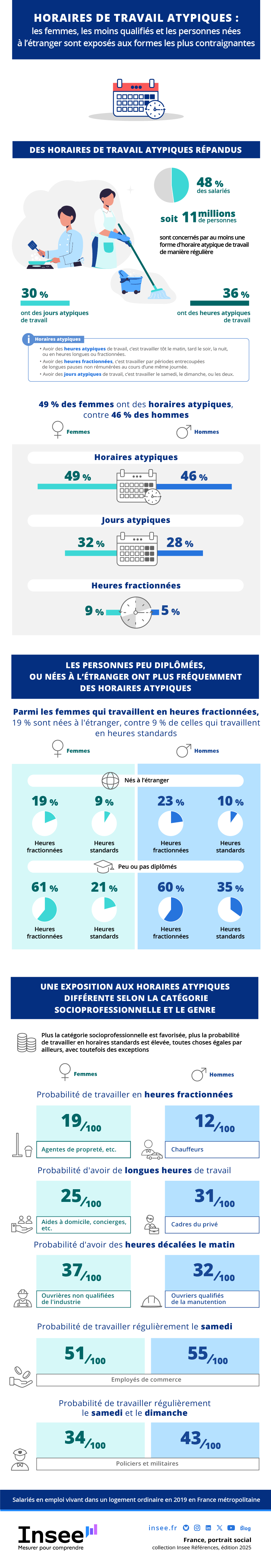 En France métropolitaine, en 2019, 48 % des salariés sont concernés, dans le cadre de leur emploi principal, par au moins une forme d’horaires atypiques, c’est‑à‑dire que leurs heures habituelles de travail sont décalées, fractionnées ou longues, ou qu’ils travaillent de manière régulière le week‑end (hors travail emporté à la maison).