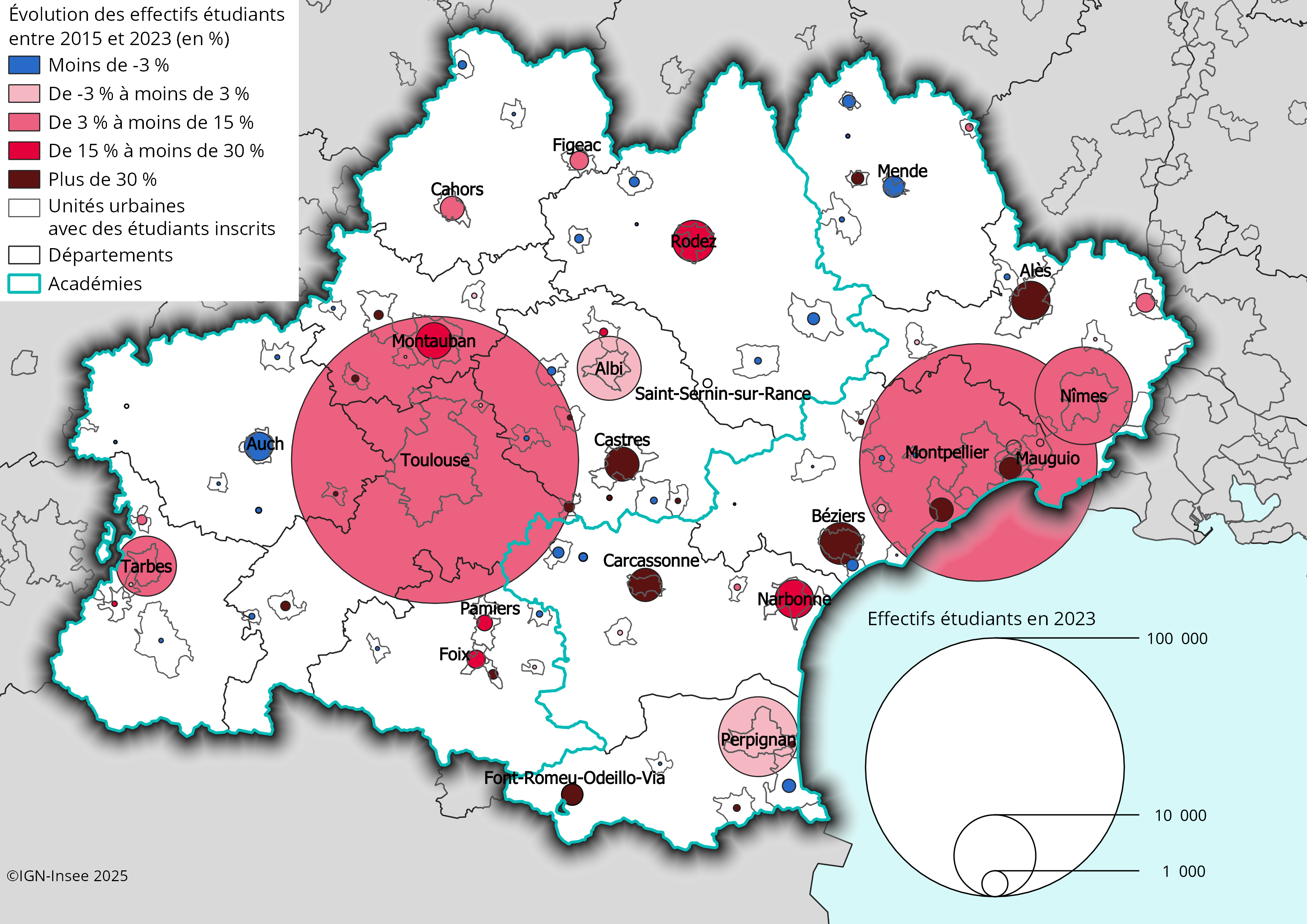 Les unités urbaines de Toulouse et de Montpellier concentrent les trois quarts des étudiants. Toutefois, la croissance des effectifs étudiants y est plus modérée que dans celles de Nîmes, d’Alès ou de Béziers. Les effectifs étudiants stagnent dans celles de Perpignan et d’Albi.
