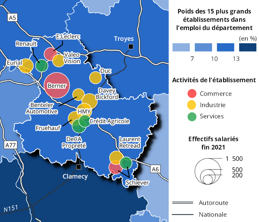 Huit établissements sont industriels, dont deux dans l’agroalimentaire : Eurial Ultra Frais et Duc. Le tertiaire est bien représenté avec quatre établissements dans le commerce, principalement de gros. Spécialiste dans la vente d’outillage professionnel, Berner est le plus grand employeur de commerce de la région avec près de 1 500 emplois (figure 1). À la tête d’enseignes comme Super U, Kiabi ou Intersport, le groupe Schiever détient plusieurs établissements icaunais, dont son siège implanté à Avallon.