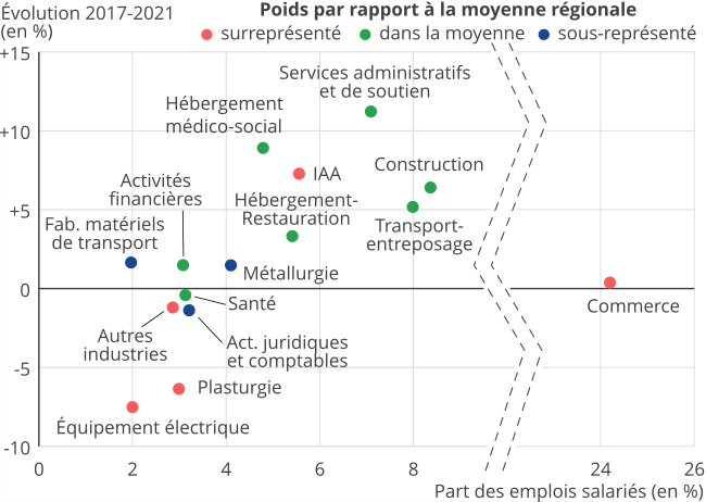 Secteurs d’activité (A38) | Part des emplois salariés (en %) | Évolution 2021/2017 (en %) | Poids par rapport à la moyenne régionale | |