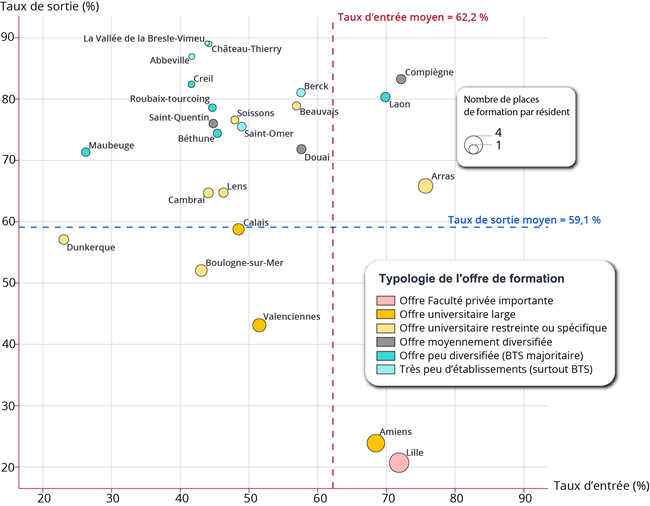 Deux zones hors siège de l’académie de Lille ont la particularité d’attirer plus d’étudiants qu’ils n’en partent. Celle d’Arras a le taux d’entrée le plus élevé de la région (75,7 %). Celle de Valenciennes a le taux de sortie le plus faible après les ZE sièges (43,1 %), grâce à son offre universitaire large. Ces deux ZE correspondent respectivement aux pôles principaux de l’université d’Artois et de l’université polytechnique des Hauts-de-France, et leur offre y est centralisée. Elles proposent respectivement 2,5 et 2,1 places par néobachelier résident. La ZE de Valenciennes attire des néobacheliers originaires des ZE reliées par son université multi-site, mais aussi des zones de Lille et de Douai. Les jeunes originaires de cette dernière rejoignent plus souvent Valenciennes qu’Arras malgré leur lien via l’université d’Artois.