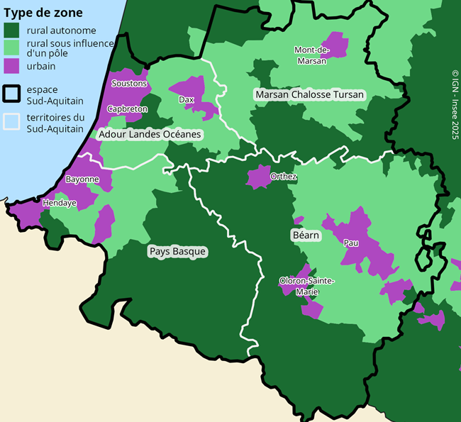 Les communes rurales sous influence des villes sont au contact direct des zones urbaines du littoral alors que les zones rurales hors influence des villes sont les plus éloignées mais ne sont pour autant pas isolées ; les communes de Saint-Jean-Pied-de-Port, Saint-Palais et Mauléon-Licharre offrent équipements, services, emplois et logements, et en cela se rapprochent de zones urbaines.