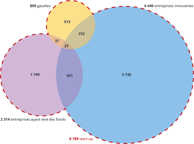 Ainsi, pour refléter la diversité des profils de start-up, cette étude prend en compte trois formes ou définitions qui se complètent et ne s’excluent pas mutuellement. La première catégorie, les gazelles, correspond aux entreprises de moins de huit ans dont le chiffre d’affaires a augmenté en moyenne de plus de 20 % par an au cours des trois dernières années, et comptant au moins dix emplois salariés en équivalent temps plein en début de période. La deuxième définition renvoie aux entreprises de moins de huit ans dont le capital social est supérieur à 200 000 euros alors qu’il était inférieur à 100 000 euros trois ans auparavant. Cela traduit une levée de fonds significative concentrée dans le temps. Enfin, la troisième définition correspond aux entreprises innovantes, identifiées au travers des aides publiques à la recherche ou à l’innovation auxquelles elles peuvent prétendre et qu’elles ont effectivement réussi à obtenir. Ce sont ainsi des entreprises de moins de huit ans ayant bénéficié d’au moins une aide comme le crédit d’impôt recherche (CIR), le crédit d’impôt innovation (CII), les dispositifs « jeune entreprise innovante » (JEI) ou « jeune entreprise universitaire » (JEU), les concours d’innovation i-Lab et i-Nov ou encore les aides à l’innovation de Bpifrance.