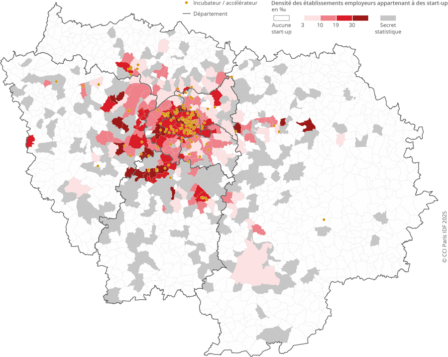 - Lecture : Dans les arrondissements centraux de Paris, pour 1 000 établissements employeurs, il y a plus de 25 établissements appartenant à des start-up franciliennes.