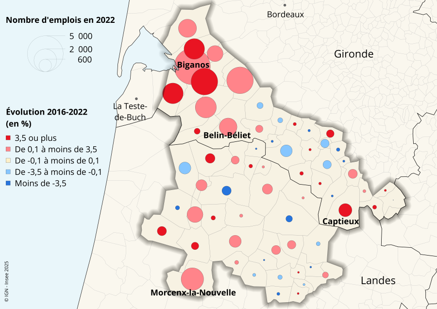 Certaines communes telles que Morcenx-la-Nouvelle et Le Barp jouent un rôle de pôle d‘emploi. Dans ces communes, les emplois sont ainsi plus nombreux que le nombre de résidents en emploi. À l’inverse, près du Bassin d’Arcachon, plusieurs communes comme Le Teich et Audenge sont plus « résidentielles » : bien qu'elles proposent de nombreux emplois, elles accueillent encore plus d’habitants, qui travaillent dans une autre commune ou hors du Parc.