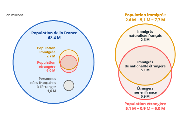Un immigré est une personne née étrangère à l'étranger et résidant en France. Les personnes nées Françaises à l'étranger et vivant en France ne sont donc pas comptabilisées. Certains immigrés ont pu devenir Français, les autres restant étrangers. Un individu continue à être immigré même s'il acquiert la nationalité française.