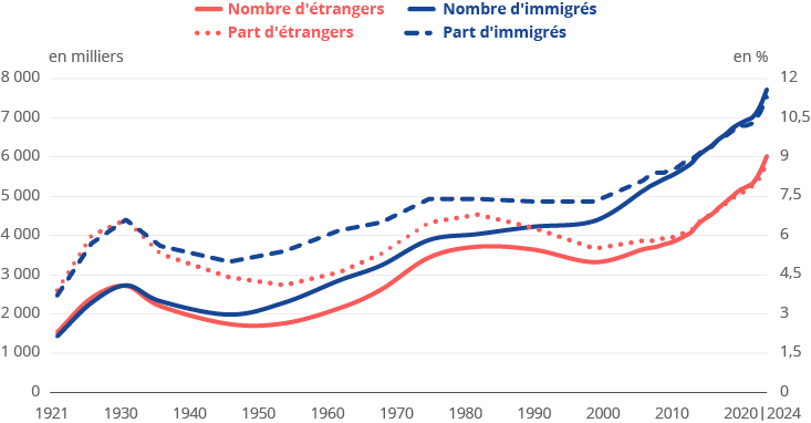 graphiqueFigure 5 – Nombre d'immigrés et d'étrangers en France depuis 1921