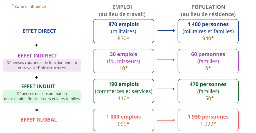 L’effet direct comptabilise le personnel militaire présent sur la base de défense et leurs familles.