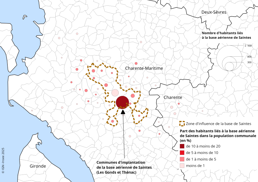 - Lecture : En 2023, 650 personnes liées à la base aérienne de Saintes résident dans les communes d’implantation (Les Gonds et Thénac), soit 19 % des habitants de ces communes réunies.