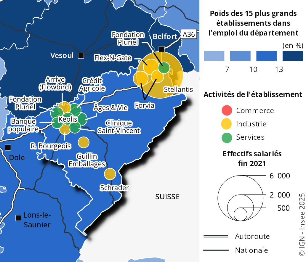 À lui seul, le site de Stellantis à Sochaux représente la moitié des effectifs cumulés des 15 plus grands établissements du Doubs. D’autres équipementiers, comme Forvia et Flex-N-Gate dans le Pays de Montbéliard, R. Bourgeois à Besançon ou Schrader à Pontarlier, renforcent cette forte spécialisation territoriale (figure 1).