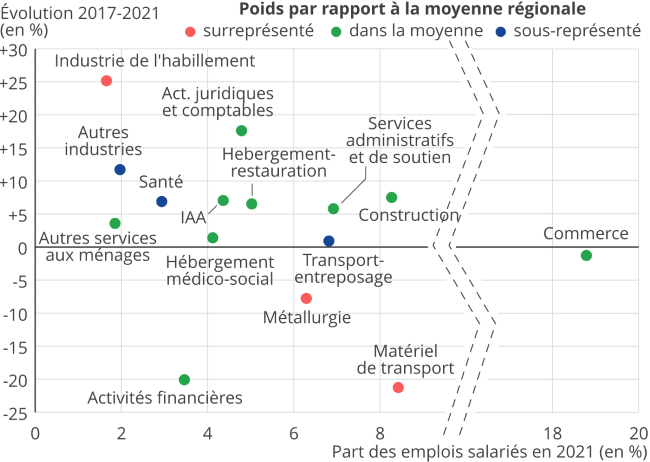 | Secteurs d’activité (A38) | Part des emplois salariés en 2021 | Évolution 2021/2017 | Poids par rapport à la moyenne régionale | |