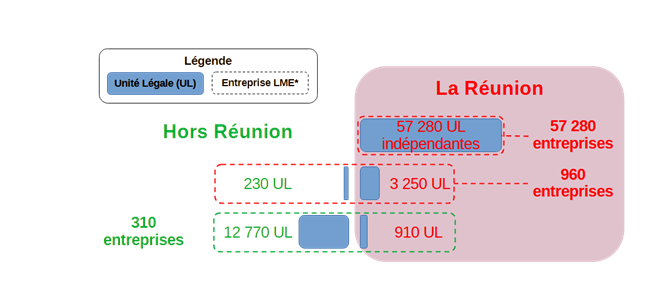- 960 entreprises regroupant 3 250 unités légales localisées à La Réunion et 230 unités légales localisées hors de La Réunion.
