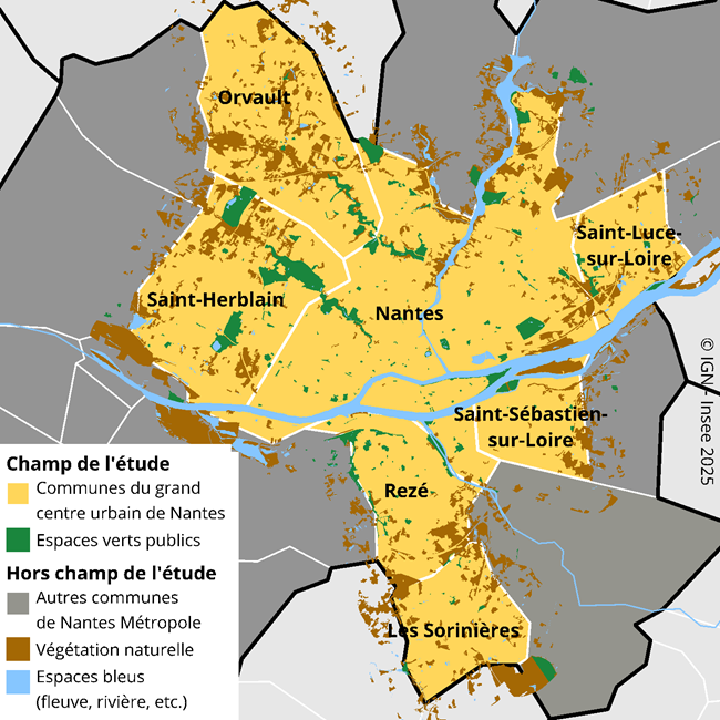Le grand centre urbain de Nantes regroupe sept communes : Les Sorinières, Nantes, Orvault, Rezé, Saint-Herblain, Sainte-Luce-sur-Loire et Saint-Sébastien-sur-Loire. Pour évaluer son niveau d’accès aux espaces verts, un référentiel de grands centres urbains comparables est défini. Il est composé de neuf grands centres urbains entre 200 000 et 700 000 habitants, sans littoral et avec un taux de couverture en forêts publiques inférieur à 5 % : Angers, Bordeaux, Dijon, Lens, Orléans, Reims, Rennes, Toulouse et Tours.