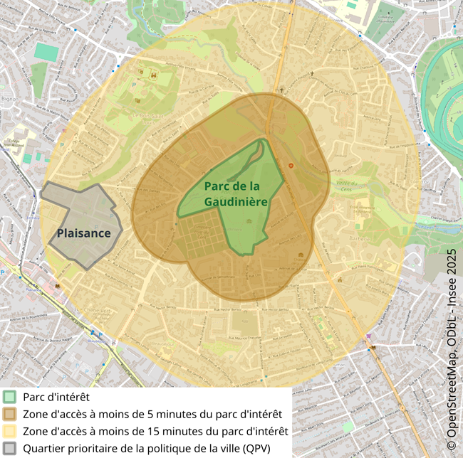 Afin de mesurer l’accès des populations, seuls les espaces verts publics sont conservés. Sont donc exclus les jardins privés, les végétations basses (telles que prairies humides, zones de broussailles, etc.) et les forêts privées. La proximité à moins de cinq minutes de marche, soit 300 m, se mesure en conservant les parcs et jardins d’au moins 0,1 ha et les forêts publiques d’au moins 0,5 ha. À partir de 300 m et jusqu’à 600 m, l’accès est mesuré autour des parcs et forêts suffisamment grands (au moins 1 ha). Enfin, de 600 à moins de 900 m, l’accès est calculé autour des plus grands parcs et forêts (au moins 10 ha). La population est calculée grâce aux données du fichier localisé social et fiscal (Filosofi) qui permet d’en connaître l’effectif dans des carreaux de 200 m de côté.