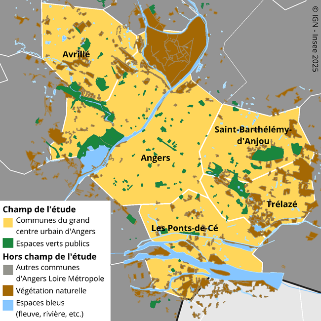 Le grand centre urbain d’Angers, composé de cinq communes, compte 210 800 habitants en 2022 (figure 1). L’accès aux espaces verts sur ce territoire est analysé au regard d’un ensemble de neuf grands centres urbains similaires, constituant le référentiel de comparaison (pour comprendre).