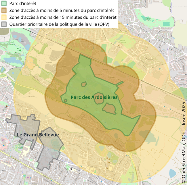 Afin de mesurer l’accès des populations, seuls les espaces verts publics sont conservés. Sont donc exclus les jardins privés, les végétations basses (telles que prairies humides, zones de broussailles, etc.) et les forêts privées. La proximité à moins de cinq minutes de marche, soit 300 m, se mesure en conservant les parcs et jardins d’au moins 0,1 ha et les forêts publiques d’au moins 0,5 ha. À partir de 300 m et jusqu’à 600 m, l’accès est mesuré autour des parcs et forêts suffisamment grands (au moins 1 ha). Enfin, de 600 à moins de 900 m, l’accès est calculé autour des plus grands parcs et forêts (au moins 10 ha). La population est calculée grâce aux données du fichier localisé social et fiscal (Filosofi) qui permet d’en connaître l’effectif dans des carreaux de 200 m de côté.