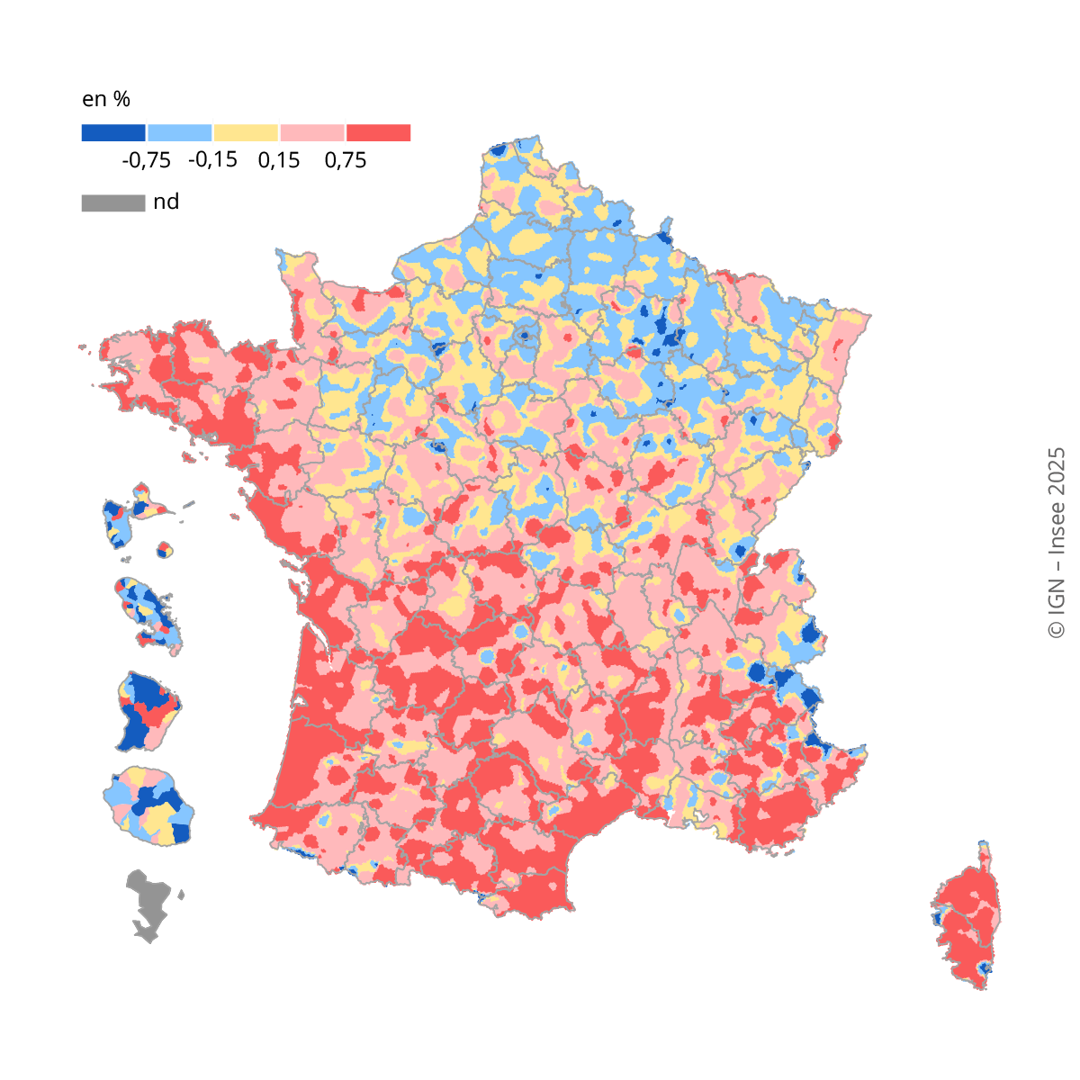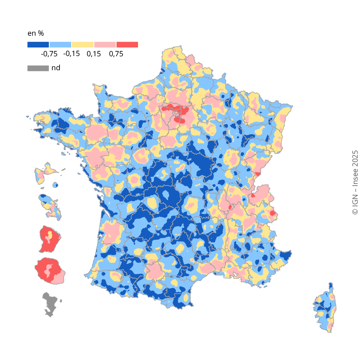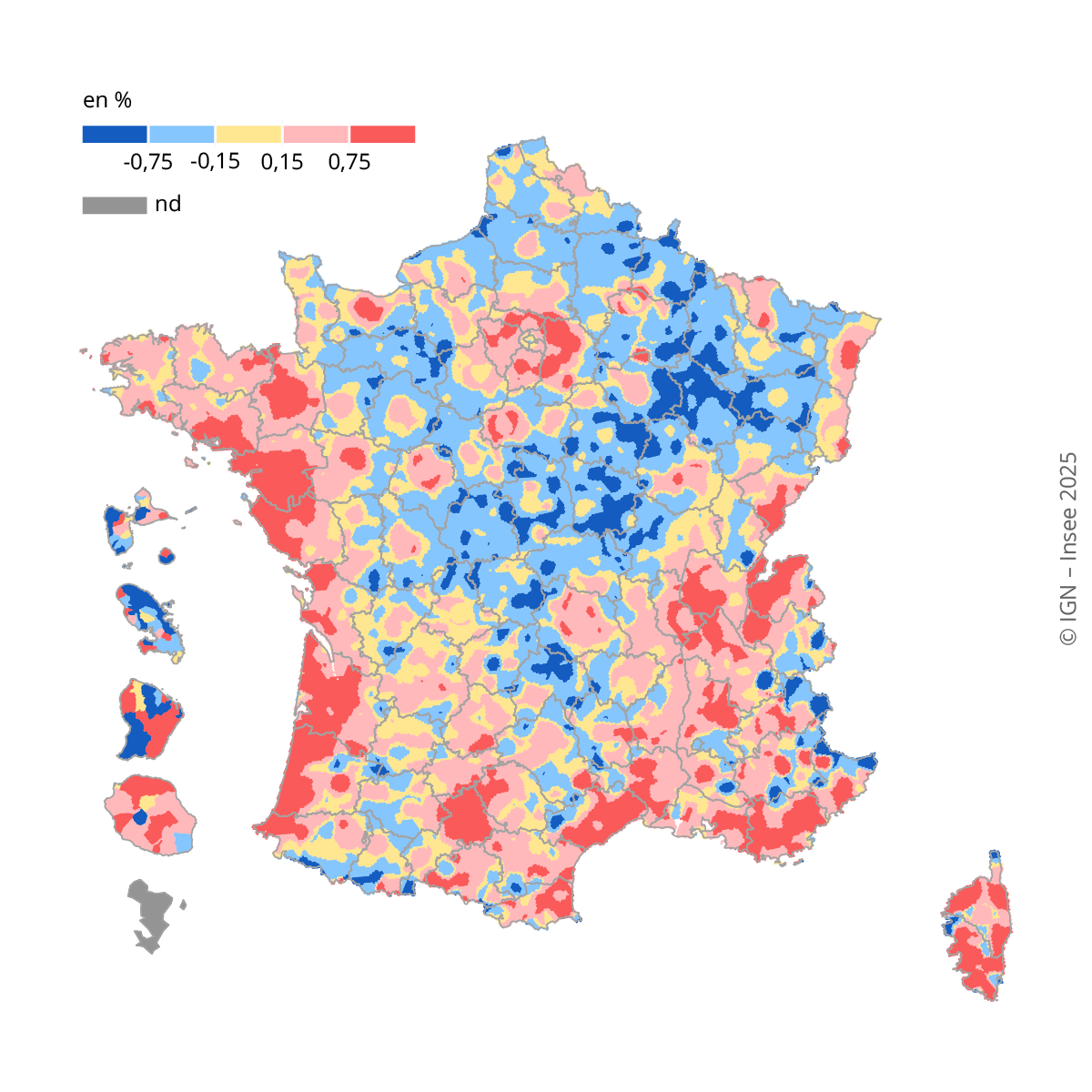 Pour la représentation cartographique des taux d’évolution de la population entre 2017 et 2023, un lissage est réalisé sur un maillage régulier de 1 km² avec un rayon de lissage de 15 km. Pour les DOM, en l’absence de carroyage de référence, les données sont représentées sur un découpage communal.