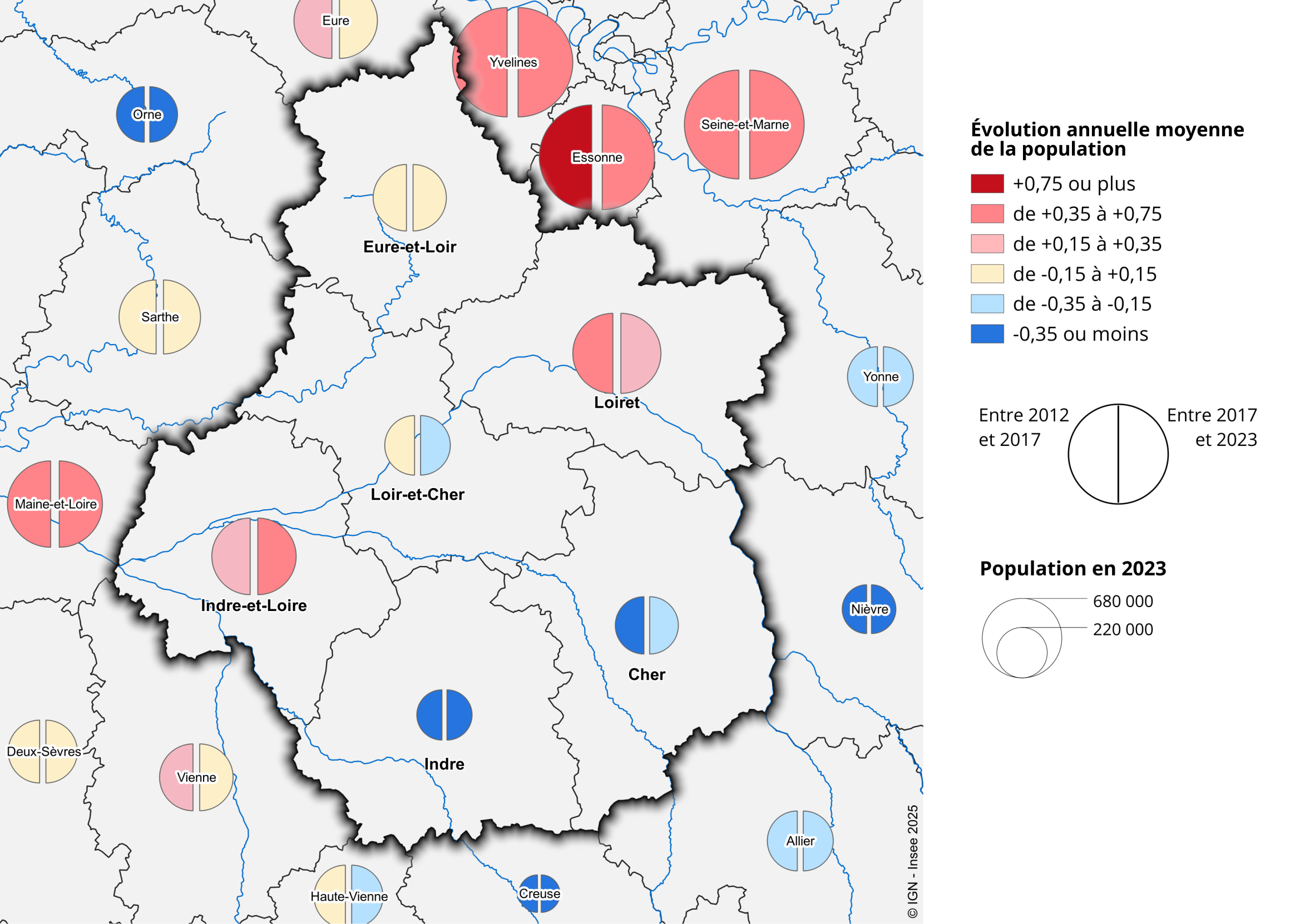 Les départements du Loiret et d’Indre‑et‑Loire regroupent la moitié de la population régionale : respectivement 691 270 et 619 360 habitants en 2023. Ce sont les seuls départements de la région dont la population augmente entre 2017 et 2023. La population du Loiret augmente ainsi de 0,3 % en moyenne chaque année (figure 1), à un rythme légèrement inférieur à celui de 2012 à 2017 (+0,5 % par an). À l’inverse, le nombre d’habitants de l’Indre‑et‑Loire augmente à un rythme supérieur : +0,4 % en moyenne chaque année entre 2017 et 2023, contre +0,3 % par an de 2012 à 2017.