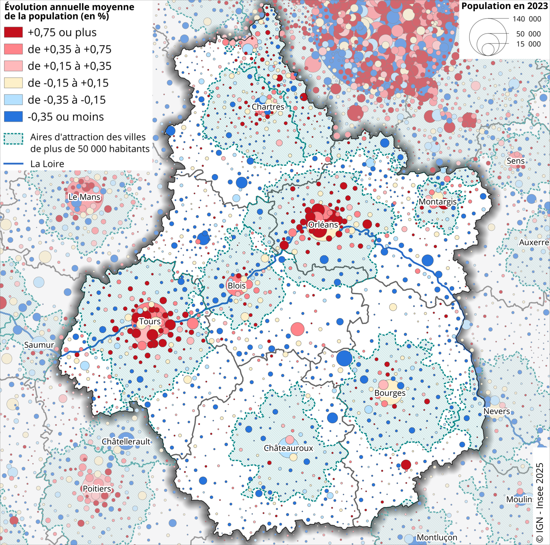 Plus de 70 % de la population régionale réside dans l’une des huit aires d’attraction des villes de plus de 50 000 habitants présentes dans la région. Entre 2017 et 2023, chaque année dans ces aires la population s’accroît globalement de 0,3 % en moyenne, particulièrement dans celles d’Orléans et de Tours. Le nombre d’habitants des pôles augmente à un rythme légèrement supérieur uniquement en raison de l’accroissement naturel. Dans les couronnes, la hausse du nombre d’habitants est principalement due à la contribution de l’excédent migratoire. La population y croît à un rythme moins élevé qu’à la période précédente : +0,2 % par an entre 2017 et 2023, contre +0,4 % entre 2012 et 2017. Dans les aires d’attraction des villes de moyenne envergure (Bourges, Chartres, Blois, Châteauroux et Montargis), le nombre d’habitants dans les couronnes est quasi-stable entre 2017 et 2023 (-0,1 % par an en moyenne) alors qu’il augmentait entre 2012 et 2017 (+0,3 % par an en moyenne). Ces couronnes ont ainsi perdu en moyenne 259 habitants par an entre 2017 et 2023, alors qu’elles gagnaient 1 122 habitants chaque année, lors des cinq années précédentes.