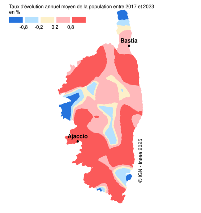 Au 1er janvier 2023, la population de référence s’établit à 355 486 habitants en Corse. Entre 2017 et 2023, la population insulaire augmente de 1,0 % en moyenne par an, soit la croissance démographique la plus élevée de l’Hexagone. Cette dynamique repose entièrement sur un solde migratoire positif : les arrivées et les retours sur l’île dépassent largement les départs, tandis que le solde naturel reste négatif. Ajaccio et Bastia poursuivent leur progression démographique et entraînent dans leur sillage les principales communes voisines.