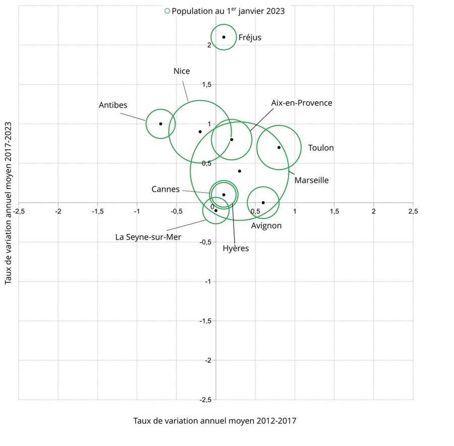 Entre 2017 et 2023, les communes de Marseille et d’Avignon se distinguent par un excédent naturel élevé (+0,5 % par an). Dans celles de Fréjus et Antibes, les migrations sont fortement excédentaires (respectivement +2,2 % par an et +1,1 %).