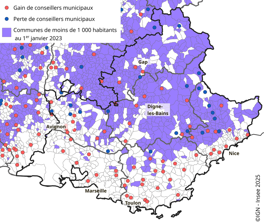 La comparaison entre les populations au 1er janvier 2017 (en vigueur pour les élections de 2020) et au 1er janvier 2023 (en vigueur pour les élections de 2026) révèle que 79 communes de la région changent de tranche d’habitants. Parmi elles, 59 verront leur nombre de conseillers municipaux augmenter (50 gagneront quatre conseillers et neuf en gagneront deux), tandis que 20 le verront diminuer (de quatre conseillers).