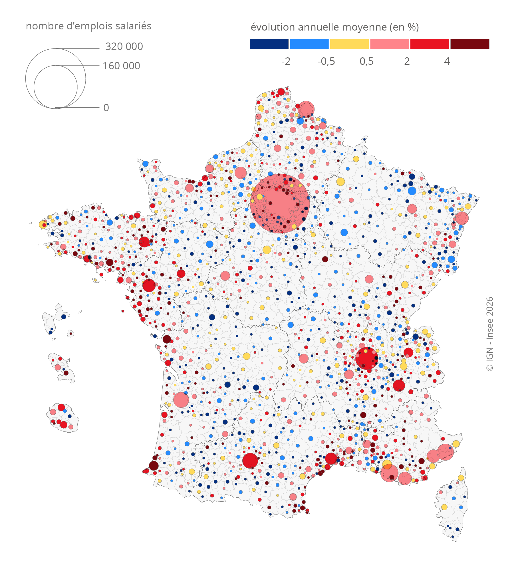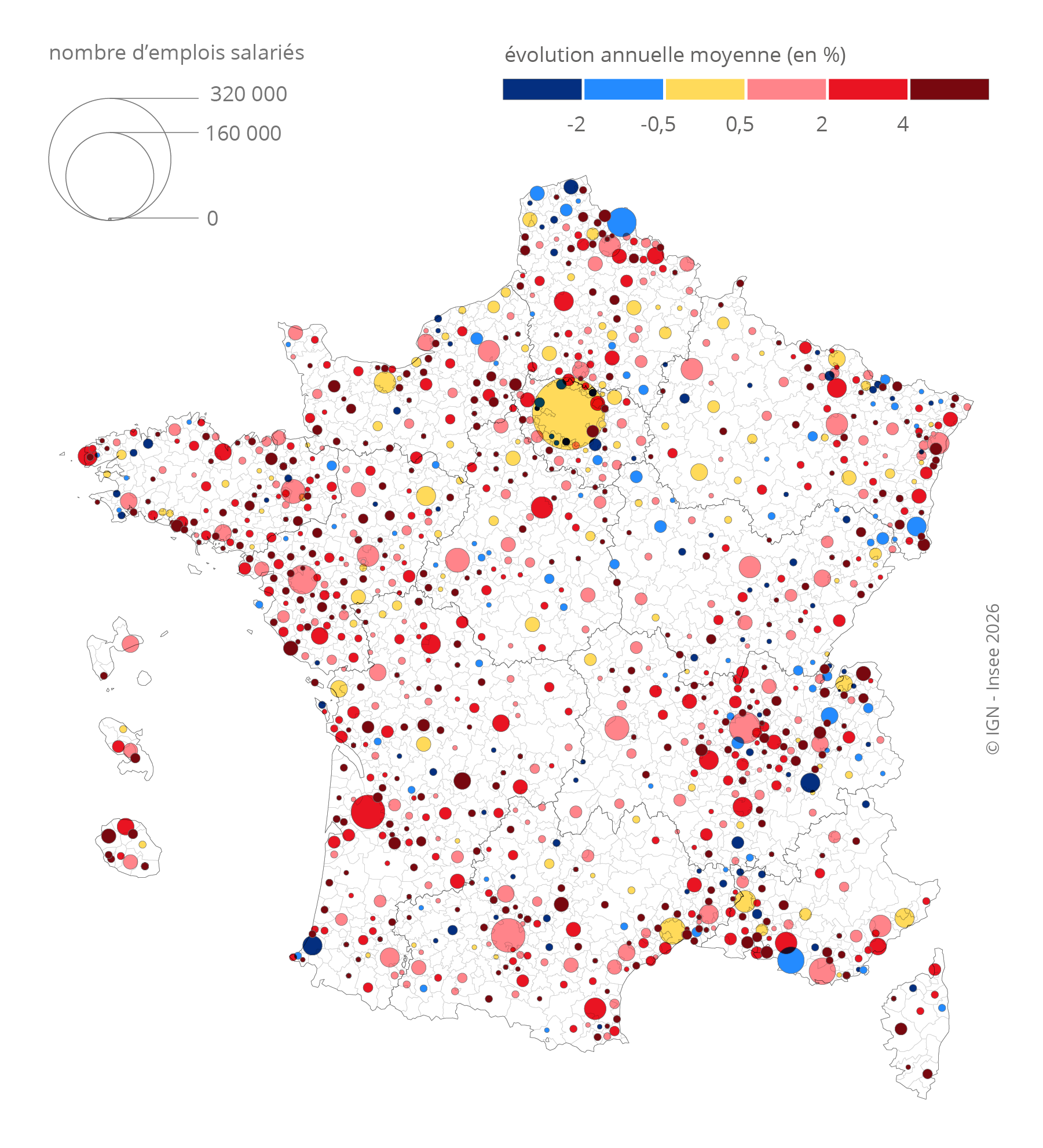 Dans la majorité des bassins de vie, par exemple à Bordeaux, à Saint-Étienne ou à Saint-Paul à La Réunion, l’emploi salarié croît plus rapidement dans les pôles de périphérie que dans ceux de centre-ville. Cette croissance peut être liée à l’émergence de pôles commerciaux entre 2016 et 2022 : par exemple, à Saint-Étienne, elle est favorisée par la construction d’un centre commercial en entrée de ville. Au contraire, il y a quelques bassins de vie où l’emploi salarié augmente dans les pôles de centre-ville tandis qu’il décline dans les pôles de périphérie, comme à Grenoble, à Lille ou à Marseille.