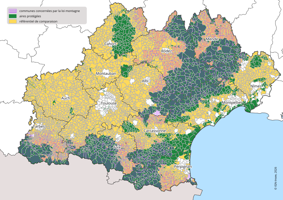 graphiqueFigure 1 – Aires protégées terrestres, référentiel de comparaison et communes loi montagne en Occitanie en 2025